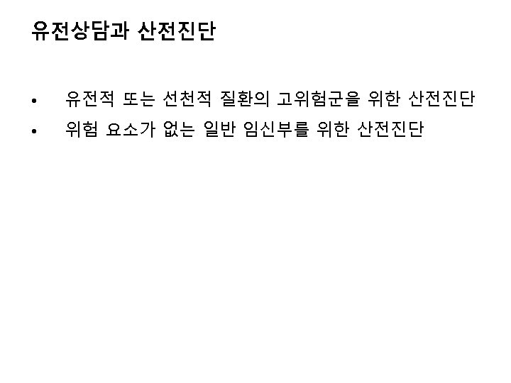 염색체 검사법 세포분열중기(metaphase)의 세포 혈액이나 양수세포는 일정기간 배양이 필요 검사법 • 띠염색(banding) • 형광제자리부합법(fluorescent in situ hybridization) • Southern blotting • Polymerase chain reaction (PCR) • 비교유전체부합법(comparative genomic hybridization)