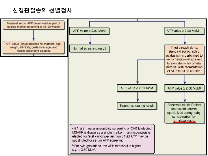 신경관결손의 선별검사 (AFP) higher levels of AFP in maternal serum and amnionic fluid