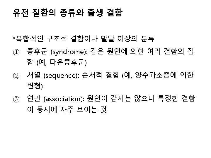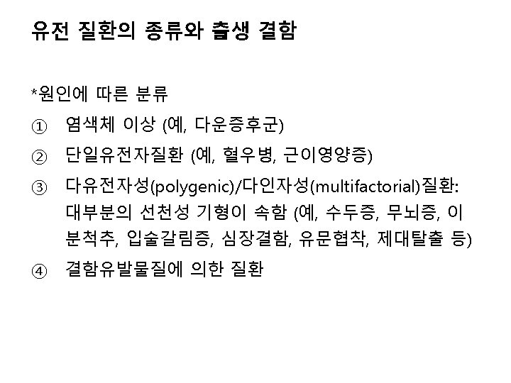 단일유전자질환 (single gene disorders, Mendelian disorders) 보통염색체 우성유전 (autosomal dominant) 보통염색체 열성유전 (autosomal recessive) Achondroplasia α 1 -Antitrypsin deficiency Acute intermittent porphyria Congenital adrenal hyperplasia Adult polycystic kidney disease Cystic fibrosis Antithrombin III deficiency Gaucher disease BRCA 1 and BRCA 2 breast cancer Hemochromatosis Ehlers-Danlos syndrome Homocystinuria Familial adenomatous polyposis Phenylketonuria Familial hypercholesterolemia Sickle cell anemia Hereditary hemorrhagic telangiectasia Tay-Sachs disease Hereditary spherocytosis Thalassemia syndromes Huntington disease Wilson disease Hypertrophic obstructive cardiomyopathy Long QT syndrome Marfan syndrome Myotonic dystrophy Neurofibromatosis type 1 and 2 Tuberous sclerosisvon Willebrand disease