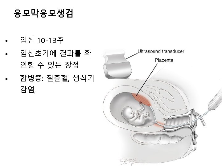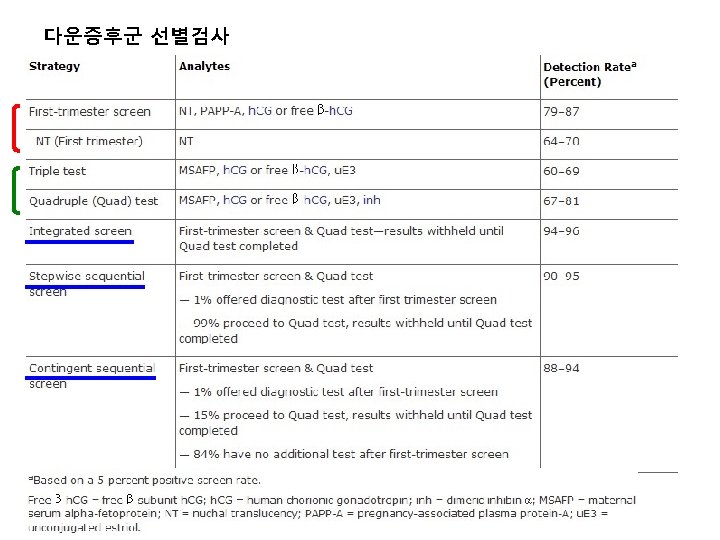 임신 제 1삼분기의 다운증후군 선별검사 1. Nuchal translucency (NT, 태아목덜미투명대)≥ 3. 5 mm 2. Maternal serum marker (PAPP-A, h. CG)