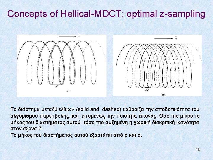 Concepts of Hellical-MDCT: Z-axis resolution Gantry angle β 0 when table location is at z 0 d: the gap of the solid helix, s=pd for the solid helix and s/2=p/2 x d, p: pitch n: detector index (1, …, N: #detector rows) 17