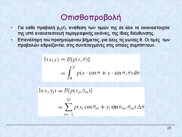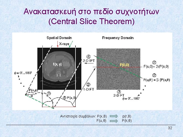 Οπισθοπροβολή (Παράδειγμα) f(x, y)= 1 2 3 4 αρχική 0 0 0 0 8 14 16 17 back-project (4, 6) at 00 4 6 13 16 19 22 back-project (1, 5, 4) at 450 αρχικοποίηση 5 11 9 10 back-project (3, 7) at 900 back-project (3, 5, 2) at 1350 τελική 30