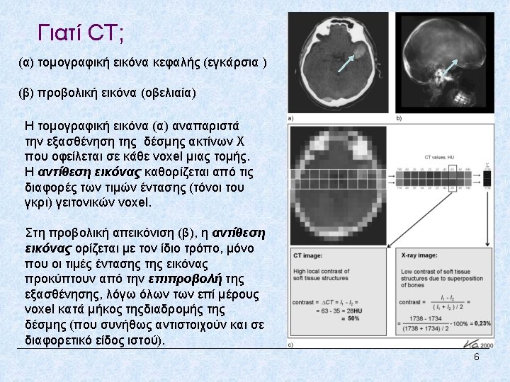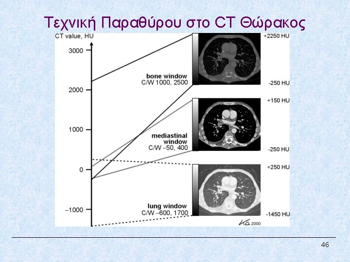Η κλίμακα Hounsfιeld The Hounsfield Unit (HU) scale is a linear transformation of the linear attenuation coefficient measurement into one in which the radiodensity of distilled water (at standard pressure and temperature) is defined as zero HU, while the radiodensity of air at STP is defined as -1000 HU. For a material X with linear attenuation coefficient μX, the HU value is therefore given by: Where μwater and μair are the linear attenuation coefficients of water and air, respectively. 44