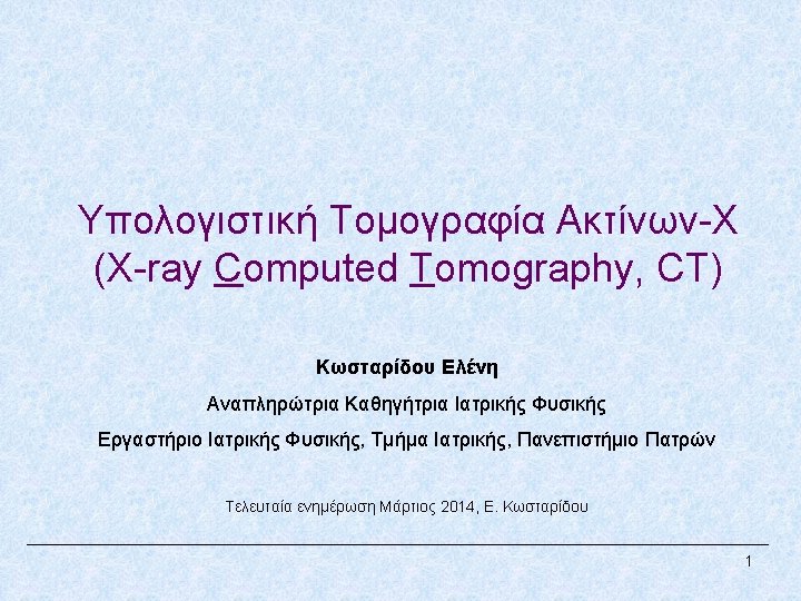 Βιβλιογραφία 1. Hui Hu. Multi-slice helical CT: Scan and Reconstruction. Med. Phys. 26(1), 1999; 5 -18. 2. Willi A. Kallender. Chapter 1: Principles of Computed Tomography. Publicis MDC Verlag, 2000, Munich, Germany. 3. David J. Goodenough, Chapter 8: Tomographic Imaging, In Handbook of Medical Imaging Vol. 1. Physics and Psychophysics, Society of Photo-Optical Instrumentation Engineers, SPIE, Press, 2000, Bellingham, Washington, USA. 4. Mahadevappa Mahesh, The AAPM/RSNA Physics Tutorial for Residents: Search for Isotropic Resolution in CT from Conventional through Multiple-Row Detector. Radio. Graphics 2002; 22: 949– 962 5. Dianna D. Cody, Mahadevappa Mahesh, AAPM/RSNA Physics Tutorial for Residents: Technologic Advances in Multidetector CT with Focus on Cardiac Imaging. Radio. Graphics 2007; 27: 1829– 1837. 6. Flohr et al, Multi–Detector Row CT Systems and Image-Reconstruction Techniques. Radiology 2005; 235: 756– 773. 7. Paul Suetens. Chapter 3: X-ray Computed Tomography. Fundamentals of Medical Imaging. Cambridge University Press, second ed. 2009, New York, USA. 8. Willi A Kalender, X-ray computed tomography (Review). Phys. Med. Biol. 51 (2006) R 29–R 43. 9. Philippe Cattin, Computed Tomography: Principles of Medical Imaging, 2013. 50