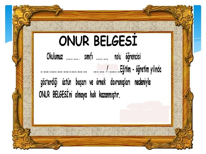 Onur belgesi ile ödüllendirme Okul öğrenci ödül ve disiplin kurulu puan şartına bağlı kalmadan; a) Türkçe'yi doğru, güzel ve etkili kullanarak örnek olmak, b) Bilimsel projeler ile sosyal etkinliklere katılmak, bu çalışmalarda liderlik yapmak, yapılan etkinliklerde eğitime katkıda bulunmak ve üstün başarı göstermek, c) Okul araç-gereç ve donanımları ile çevreyi koruma ve gözetmede davranışlarıyla örnek olmak, ç) Görgü kurallarına uymada ve insan ilişkilerinde örnek olmak, d) Trafik kurallarına uymada örnek davranışlar sergilemek, e) Bilişim araçlarını kullanmada iyi örnek olacak davranışlar sergilemek, f) Okula ve derslere düzenli olarak gelmek, bu yönde arkadaşlarına iyi örnek olmak, g) Yaşlı, yetim, öksüz, güçsüz, engelli ve benzeri durumda olanlara yardım amacıyla yürütülen toplum hizmetlerinde görev almak
