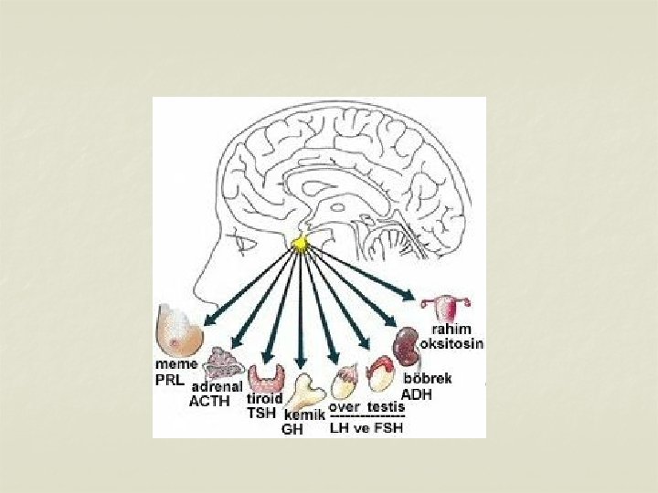 Hormon Üreten Organlar n n n Dış salgı bezi : Ürettiği salgıyı (enzim, tükürük…) özel bir kanalla ilgili organa yollar. İç salgı bezi : Ürettiği salgıyı (hormon) doğrudan kana verir. Karma salgı bezi : 2 çeşit salgı maddesi (enzim ve hormon) üretip hem kana hem de ilgili organa ayrı yollar.