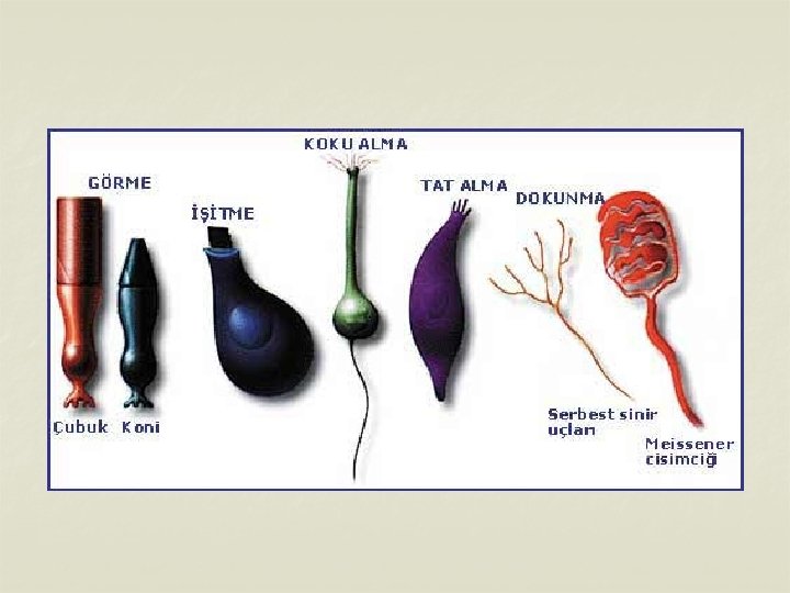 SİNİRLER VE ÖZELLİKLERİ n n n Sinir hücrelerinde taşınan sinirsel bilgilere (mesajlara) uyartı (impuls) denir. Bir sinir hücresi üzerinde uyartıların taşınma hızı sabittir. Sinir sistemindeki duyu nöronları merkezi sinir sistemine uyartıları taşırken, motor nöronlarda merkezi sinir sisteminden organlara doğru uyartıları taşır.