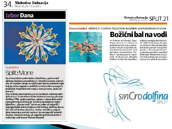 ~Natjecanja u Hrvatskoj i inozemstvu, tradicionalne ljetne i božićne revije, treninzi i osmišljavanje koreografija, šljokičasti kostimi i podvodna muzika – naša su svakodnevnica. U toj vedroj atmosferi stasale su generacije plivačica, razvijao se sportski duh, a stvarala su se i neraskidiva prijateljstva. U našoj maloj poljudskoj radionici čarolija i dalje traje– biraju se nove glazbe, smišljaju se novi pokreti, vježba se, uči i stvara pod budnim okom trenerica, koje su isto tako jednom bile plivačice.