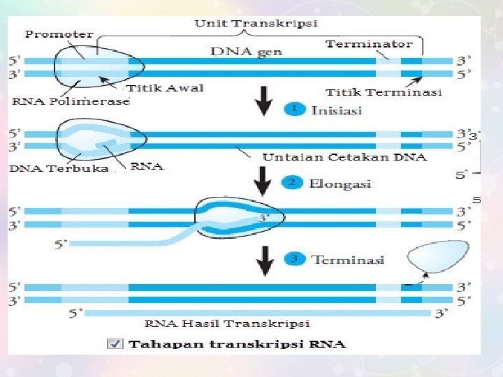 TRANSKRIPSI : 3. TERMINASI Transkripsi berlangsung sampai RNA polimerase mentranskripsi urutan DNA yang disebut terminator. Terminator yang ditranskripsi merupakan suatu urutan RNA yang berfungsi sebagai sinyal terminasi yang sesungguhnya. Pada sel prokariotik, transkripsi biasanya berhenti tepat pada akhir sinyal terminasi; yaitu, polimerase mencapai titik terminasi sambil melepas RNA dan DNA.