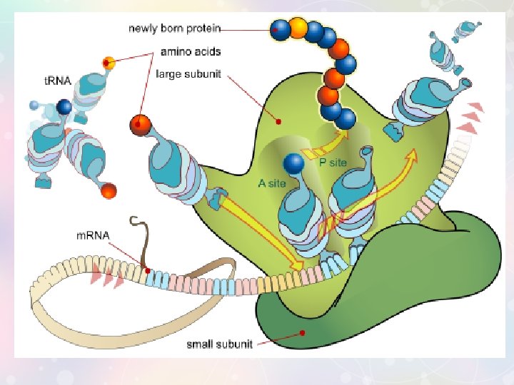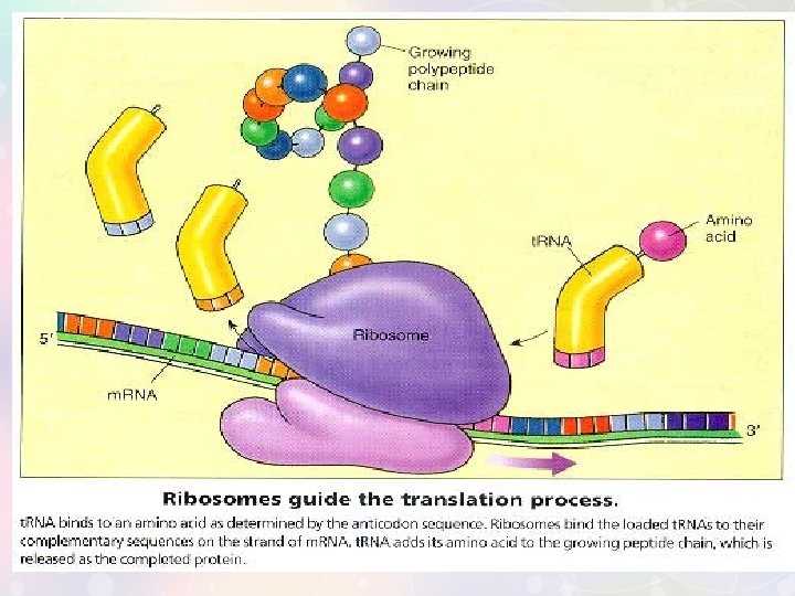 TRANSLASI : 2. ELONGASI Pada tahap elongasi dari translasi, asam amino – asam amino ditambahkan satu per satu pada asam amino pertama (metionin). Kodon m. RNA pada ribosom membentuk ikatan hidrogen dengan antikodon molekul t. RNA yang baru masuk yang membawa asam amino yang tepat. Molekul r. RNA dari sub unit ribosom besar berfungsi sebagai enzim, yaitu mengkatalisis pembentukan ikatan peptida yang menggabungkan polipeptida yang memanjang ke asam amino yang baru tiba.