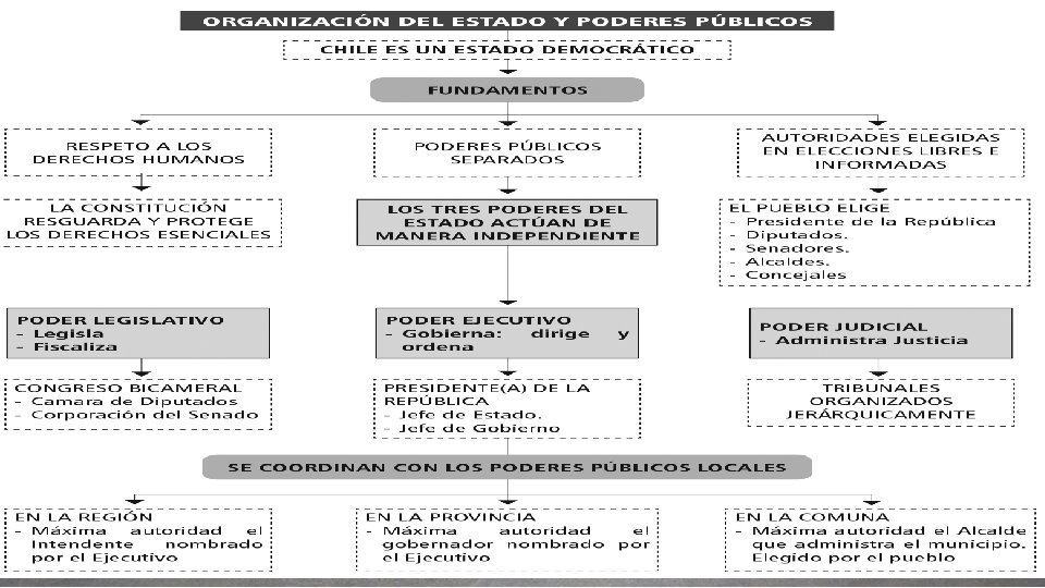 LA INSTITUCIONALIDAD CHILENA Objetivos abordados: • Evaluar las características y funcionamiento de la institucionalidad democrática, las formas de representación y su impacto en la distribución del poder en la sociedad a la luz del bien común, la cohesión y la justicia social. • Comprender y valorar el Estado de derecho como marco legal que debe resguardar el ejercicio de los Derechos Humanos, regular el poder de los gobernantes y organizar la convivencia política y social. • Analizar la forma en que la constitución organiza el Estado chileno en diferentes funciones y órganos públicos, que poseen atribuciones especificas y complementarias • Comprender la importancia de la participación para la pervivencia del sistema político y para la profundización de la democracia.