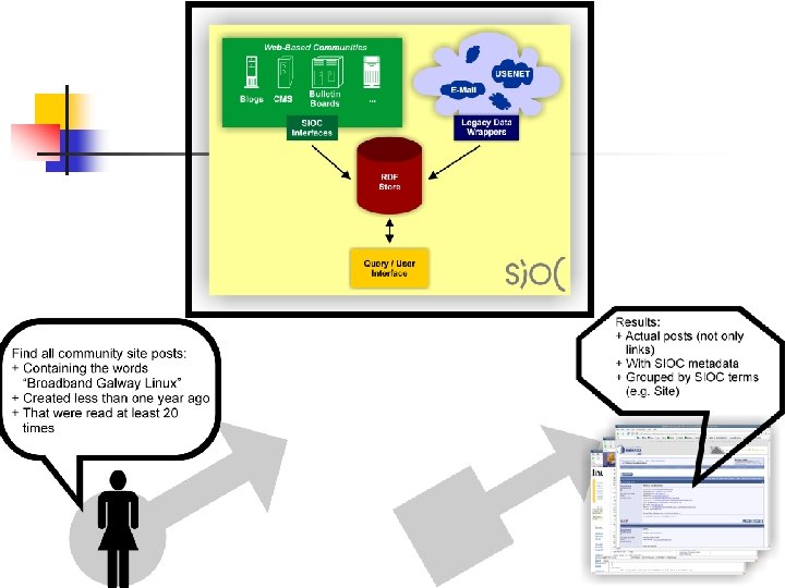Example : a blog entry • Post titled "Creating connections between discussion clouds with SIOC" created at 09: 33: 30 on 2006 -09 -07 written by a user "Cloud" on topics "Blogs" and "Semantic Web" with contents described in sioc: content. • More information about its author can be found at http: //johnbreslin. com/blog/index. php? sioc_type=user&sioc_id=1 • The post has a reply and detailed SIOC information about this reply can be found at http: //johnbreslin. com/blog/index. php? sioc_type=comment&sioc_id=123928