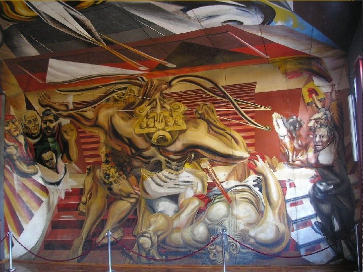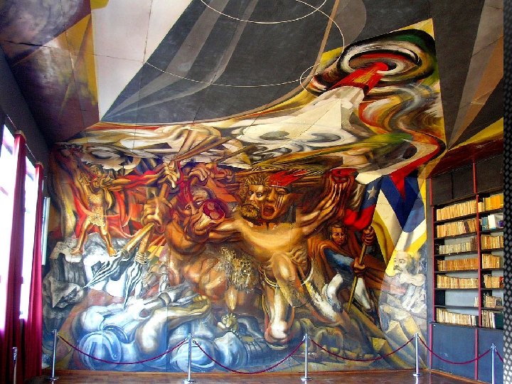 § § § Mural Muerte al Invasor El 24 de mayo de 1940 participó en el intento de asesinar a Trotsky y en 1941 parte a Chile. En Chillán, pintó el mural Muerte al invasor, en la escuela México Este mural pintado en la Biblioteca de la escuela consiste en dos muros frontales de 8 x 5 mt. cada uno y un techo de 160 mt. ² pintado a la piroxilina, Fue realizado con la colaboración del alemán Erwin Werner, el colombiano Alipio Jaramillo y los chilenos Luis Vargas Rosas, Camilo Mori y Gregorio de la Fuente. En 1946 Siqueiros regresó a México donde pintó una serie de murales Imagen en wikipedia. com (Al Bustos)
