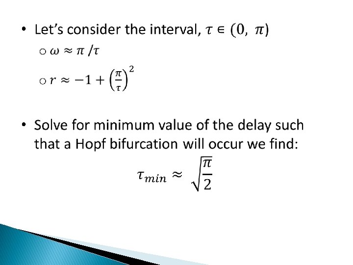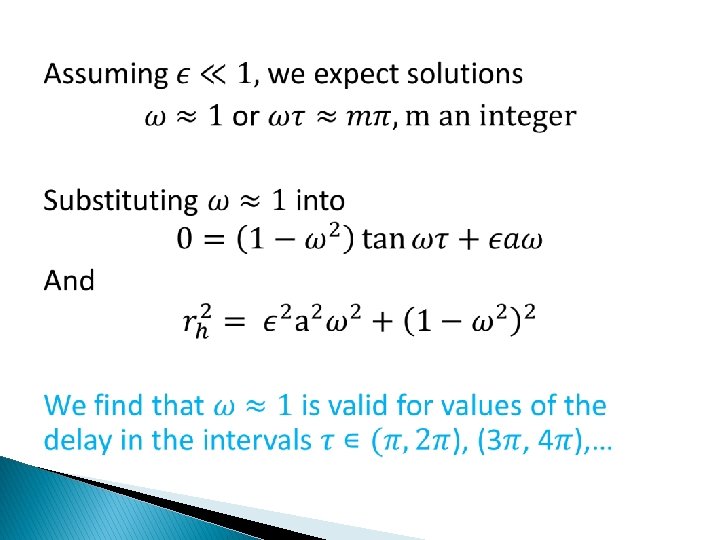 Rescaled Equations � dx/dt=-y-εx(a+by)+ry(t-τ) � dy/dt=x(1+y) where ε=√(μΒ)/γ 2<<1 and r=(e-μτ rγγ)/(μ+γ) and a, b are really close to 1 � Rescaled equation for r is a primary control parameter � r is the fraction of those in S who return to S after being infected
