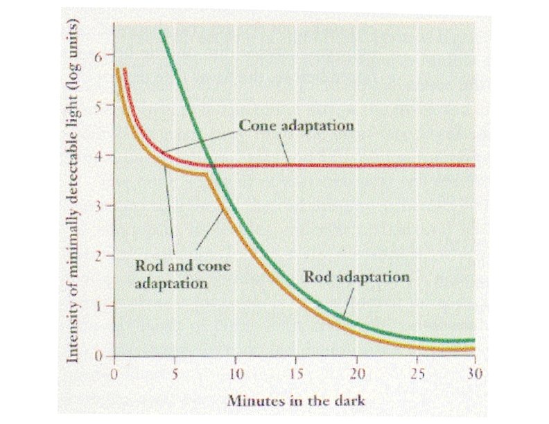 Seeing in the dark • 1 st adaptation (3 -to-4 -minutes) are the cones adapting • 2 nd adaptation (after 7 -min) are the rods adapting • Best “dark vision” is mediated by rods – This is due to the “convergence” of many rods (explained below)