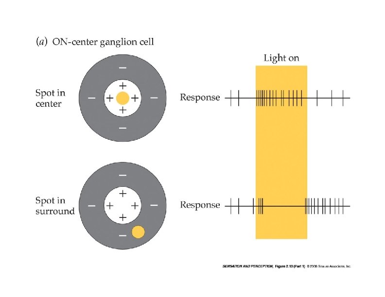 Finding the “receptive field” of Ganglion Cells: Hubel & Wiesel (1961) • Looked at cat’s eyes and ganglion cells (remember, Ganglion axons are the optic nerve) • Cat is immobilized while looking at a screen of “spots” of light • Activity of Ganglion cells measured as light spots are moved around