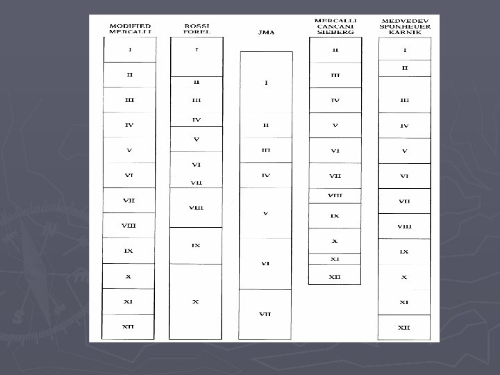 Magnitud local de Richter ML Originalmente diseñada para el Sur de California. Se utilizo un instrumento Wood-Anderson de TS=0. 8 s , amortiguamiento de 0. 8 y Amplificación máxima de 2800. ► Se midió sobre la onda máxima del registro. ► Se definió así: ML= log. Amax- log A 0 siendo A 0 la amplitud máxima en mm registrada por el instrumento de un terremoto de ML=0 a una distancia variable entre 0 -600 km. ► Hasta 1944 hay una sobreestimación de los valores. ► Desde 1975 hay una disminución del umbral de detección. ► Se ha extendido esta definición a numerosas áreas sísmicas en diferentes países. ► ►