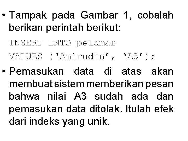 • Tampak pada Gambar 1, cobalah berikan perintah berikut: INSERT INTO pelamar VALUES (‘Amirudin’, ‘A 3’); • Pemasukan data di atas akan membuat sistem memberikan pesan bahwa nilai A 3 sudah ada dan pemasukan data ditolak. Itulah efek dari indeks yang unik.
