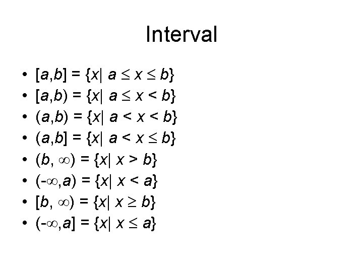 Pertidaksamaan • Permasalahan matematika yang berkaitan dengan interval terletak pada pertidaksamaan aljabar. • Himpunan jawab atau solusi dari pertidaksamaan aljabar merupakan salah satu dari bentuk interval.