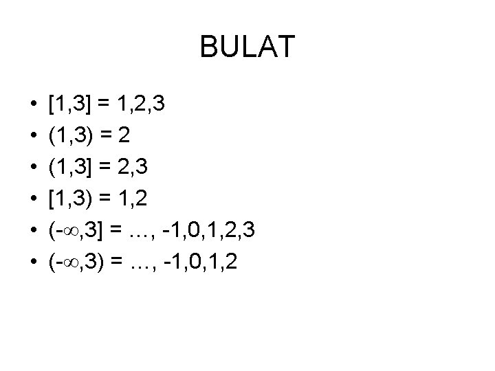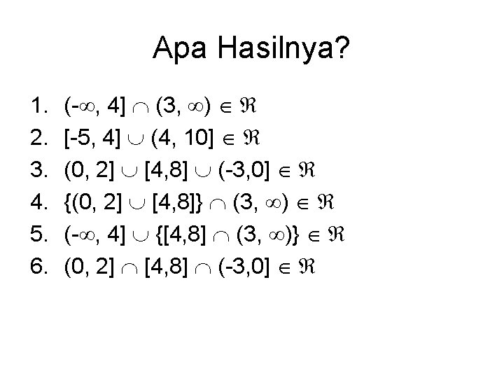 Apa Hasilnya? 1. 2. 3. 4. {(100, ) (- , 4)} [4, 5] Z {[1, 2) (5, 6] [2, 5)} (0, 1] Z {(5, 6] (- , 7]} {[2, 5) (- , 4)} Z