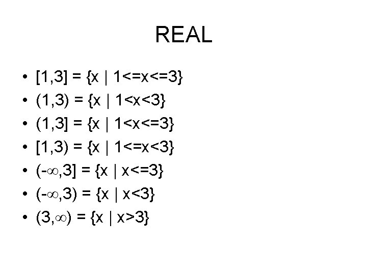 Bilangan • Bilangan: – Real (R) positif dan negatif genap dan ganjil bulat (Z) dan pecahan (Q) (- , ) – Imaginer (I) • Bilangan asli: 1, 2, 3, … [1, ) • Bilangan cacah: 0, 1, 2, … [0, )