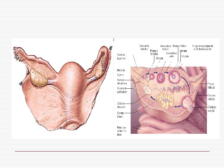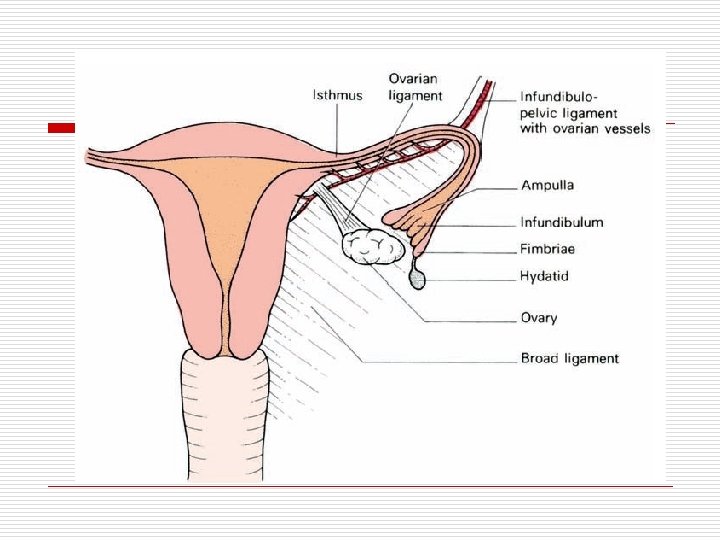 Ovarium o ALMOND, UK 4 -2 cm DISISI UTERUS. TDD o EXTREMITI SUPERIOR DIIKAT O/ FIMBRAE & LIG. SUSPENSORIUM OVARII VASA OVARICA o EXTREMITI INFOR IKAT O/ LIG. OVARII PROPRIUM LIG. LATUM o MARGO ANTERIOR & POSTERIOR o POSISI IBU HAMIL &STLH MELAHIRKAN KONTRAKSI UTERUS TDK KEMBALI PD KEADAAN SEMULA. o TUA ATROPI