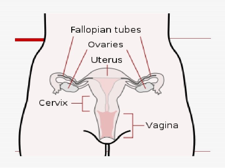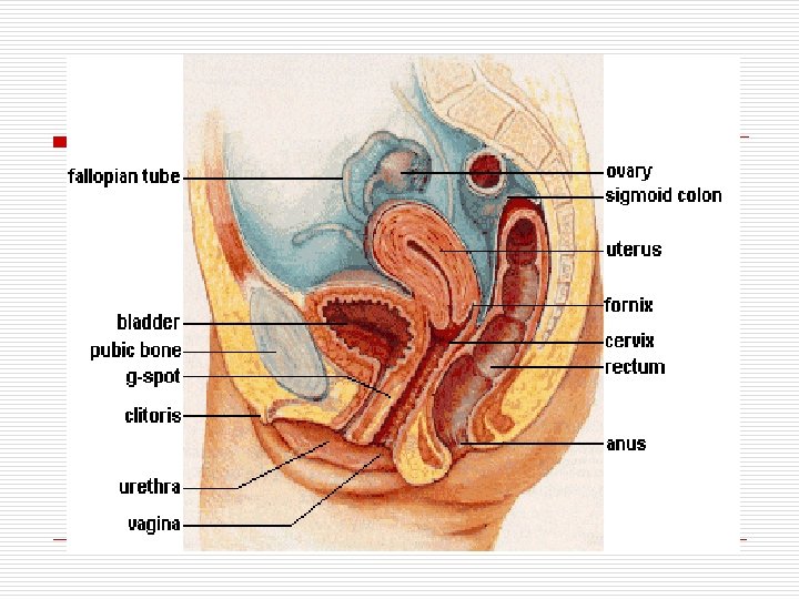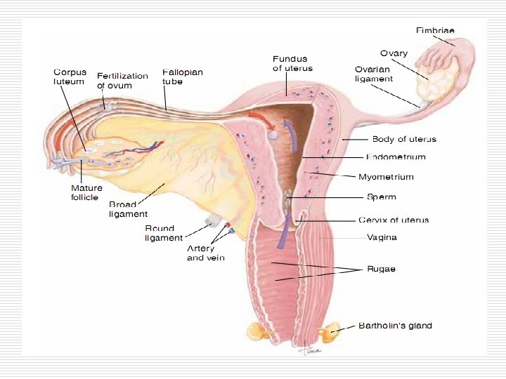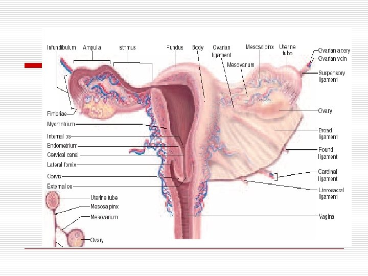 Genitalia muliebris o o o o EXTERNA - Mons pubis - Labia mayor dan minora - Clitoris - Orf. Urethra ext - Orf. Vagina ext - Kel. Ascessorius Brd diafragma o Interna o - Ovarium o - Tuba uterina o - Uterus o - Vagina o Brd dalam pelvis