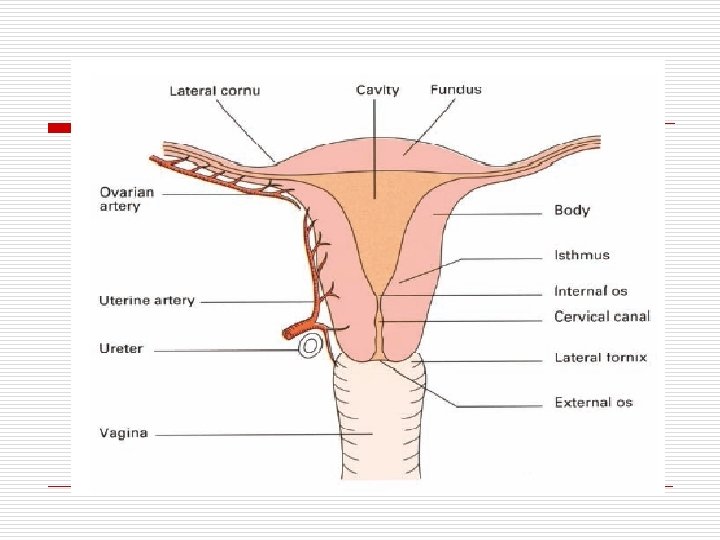 u u u u FIXAXI UTERUS TDD: PENYOKONG DIAFRAGMA PELVIS PENGGANTUNG TDD: -LIG. LATUM MULAI PD SISI-2 UTERUS S/D DDG PELVIS - LIG. TERES UTERI PITA PIPIH ADA DI SISI UTERUS - LIG. CARDINALE POSISI UTERUS: - FETUS CAVUM ABD - PUBERTAS PELVIS - MENS BESAR - HAMIL BESAR REGIO EPIGASTRICA - SDH MELAHIRKAN UK SEMULA & CAVUM LBH BESAR - TUA ATROPI