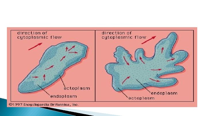 Gerak amoeboid � Gerak amoeboid merupakan gerak yang dilakukan oleh spesies Amoeba. � Gerak yang dilakukan menggunakan kaki semu (pseudopodium). � Fungsi lain pseudopodia adalah untuk mengelilingi dan menangkap mangsa, suatu proses yang disebut fagositosis. � Teori gerak amoeboid “perubahan kekentalan sitoplasma”. Terbagi atas ektoplasma (bagian tepi) dan endoplasma (bagian tengah): plasmagel dan plasmasol.