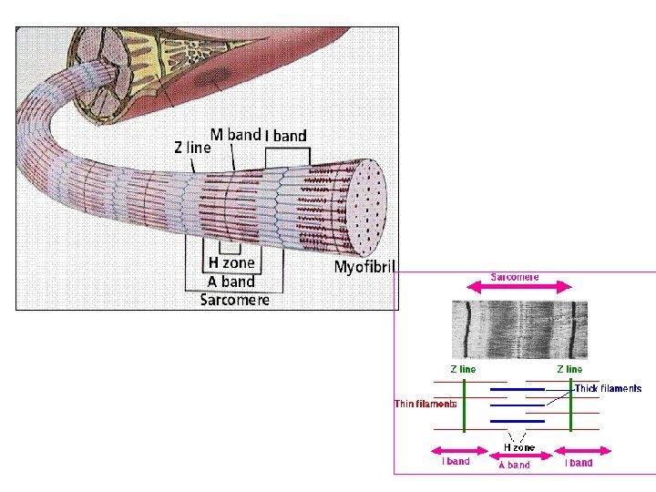 Struktur Anatomi Jaringan Otot n Jaringan otot rangka tersusun dari sejumlah berkas otot yang dibungkus oleh suatu selaput yang disebut fasia superfisialis n n Berkas otot tersusun atas serabut otot atau benang otot yang terbentuk oleh sel-sel otot yang panjang Di dalam sel-sel otot terdapat serabut-serabut yaitu benang-benang fibril protein aktin dan miosin Pada sel otot tampak garis gelap dan terang yang melintang antarsisi Garis-garis gelap dan berselang-seling ini tampak bagian-bagian yang disebut sebagai zona H (daerah terang di tengah pita gelap A), garis gelap M (di tengah daerah zona H), garis gelap Z (terletak di tengah daerah terang atau zona I)