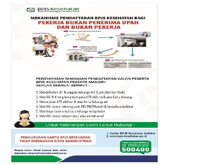 PENDAFTARAN PESERTA PEKERJA BUKAN PENERIMA UPAH DAN BUKAN PEKERJA CALON PESERTA 1. Mengisi Daftar Isian Peserta dengan mebawa : Kartu Keluarga/KTP/paspor Pas Foto 3 X 4 sebanyak 1 lbr KANTOR BPJS KESEHATAN 3. Peserta Membayar lewat ATM/Tunai sesuai dengan Nomor Virtual Account BANK Teller / ATM 2. Setelah data diproses oleh petugas maka akan diberi nomor Virtual Account 4. Dengan membawa bukti pembayaran untuk dicetakkan Kartu BPJS Kesehatan 5. Peserta memperoleh Kartu BPJS Kesehatan