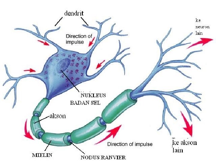 • DENDRIT : Tonjolan sitoplasma dari badan sel. Untuk mengubah rangsangan menjadi impuls, lalu meneruskannya ke badan sel • BADAN SEL : Meneruskan impuls dari dendrit ke neurit • NEURIT / AKSON : meneruskan impuls ke sel syaraf lainnya.