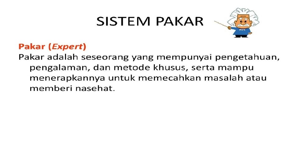 MANFAAT SISTEM PAKAR 1. Memungkinkan orang awam bisa mengerjakan pekerjaan para ahli 2. Bisa melakukan proses secara berulang secara otomatis 3. Menyimpan pengetahuan dan keahlian para pakar 4. Memiliki reliabilitas 5. Mampu melestarikan keahlian para pakar (terutama keahlian langka)