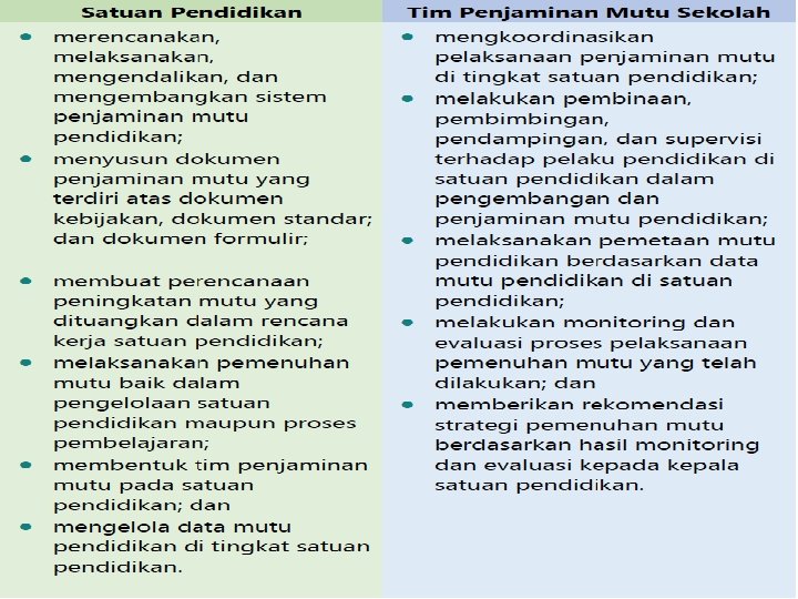 PEMBAGIAN PERANAN Dalam Sistem Penjaminan Mutu Internal Sekolah a. merencanakan, melaksanakan, mengendalikan, dan mengembangkan SPMI; b. menyusun dokumen SPMI c. membuat perencanaan peningkatan mutu yang dituangkan dalam Rencana Kerja Sekolah; d. melaksanakan pemenuhan mutu baik dalam pengelolaan sekolah maupun proses pembelajaran; e. menetapkan standar baru dan menyusun strategi peningkatan mutu berdasarkan hasil monitoring dan evaluasi; f. membentuk unit penjaminan mutu atau mengintegrasikan SPMI pada manajemen satuan pendidikan; dan g. mengelola data mutu pendidikan di tingkat satuan pendidikan dibantu Tim Penjaminan Mutu Pendidikan Sekolah a. Mengkoordinasikan pelaksanaan penjaminan mutu di tingkat satuan pendidikan; b. melakukan pembinaan, pembimbingan, pendampingan, dan supervisi terhadap pelaku pendidikan di satuan pendidikan dalam pengembangan penjaminan mutu pendidikan; c. melaksanakan pemetaan mutu pendidikan berdasarkan data mutu pendidikan di satuan pendidikan; d. melakukan monitoring dan evaluasi proses pelaksanaan pemenuhan mutu yang telah dilakukan; dan e. memberikan rekomendasi strategi peningkatan mutu berdasarkan hasil monitoring dan evaluasi