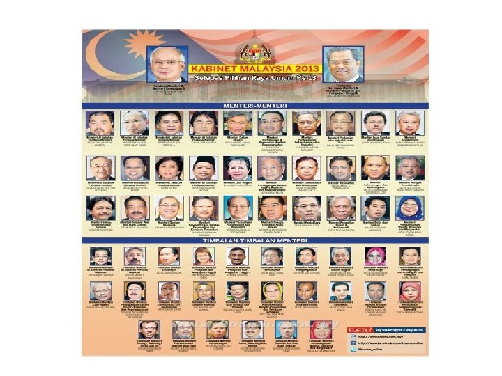 AHLI KABINET MALAYSIA 2013 Y. A. B. DATO' SERI HAJI MOHD. NAJIB BIN TUN HAJI ABDUL RAZAK Perdana Menteri merangkap Menteri Kewangan Y. A. B. TAN SRI DATO' HAJI MUHYIDDIN BIN MOHD. YASSIN Timbalan Perdana Menteri merangkap Menteri Pendidikan