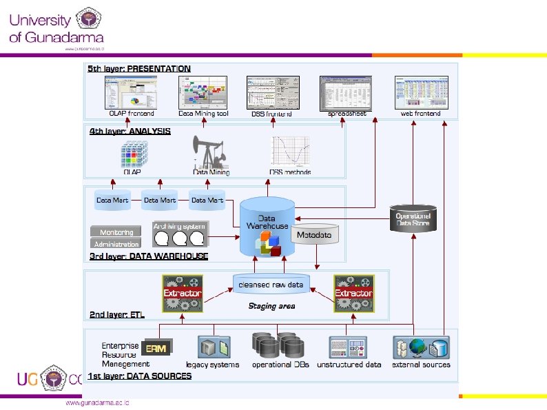 Population & Refreshing the Warehouse • Data extraction • Data cleaning • Data transformation § Mengubah format legacy/host ke format warehouse • Load § Sort, summarize, consolidate, compute views, check integrity, build indexes, partition • Refresh § Menyebarkan pembaharuan dari sumber ke warehouse/gudang
