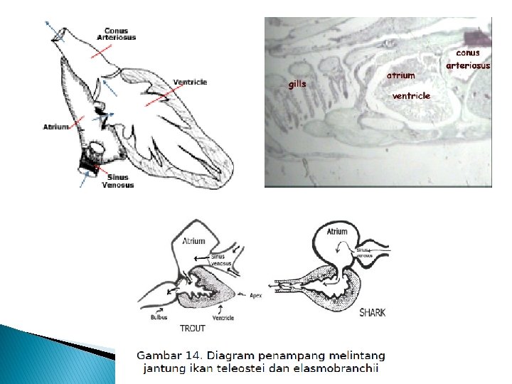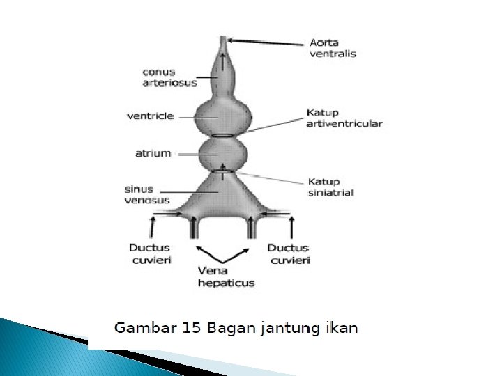 �Jantung pada ikan terdiri atas 4 ruang, dengan 2 ruang utama yang terletak berurutan. �SINUS VENOSUS. Merupakan ruang jantung pertama yang paling belakang, sebagai ruang penerima pertama darah dari seluruh tubuh. �Didepannya dinamakan ATRIUM, sebagai ruang jantung kedua dengan dinding lebih tebal dari sinus venosus dan mempunyai katup pada bagian depannya untuk menjaga agar darah yang sudah keluar dari ruang tersebut tidak kembali. Ruang