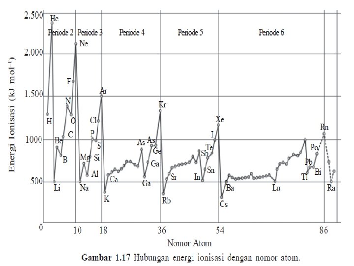 b. jumlah elektron di kulit dalam (makin byk elektron dikulit dalam makin kecil energi ionisasinya) c. muatan inti positif (makin besar muatan inti makin besar energi ionisasinya) Dalam satu golongan EI dari atas ke bawah makin kecil Dalam satu periode EI dari kiri ke kanan makin besar
