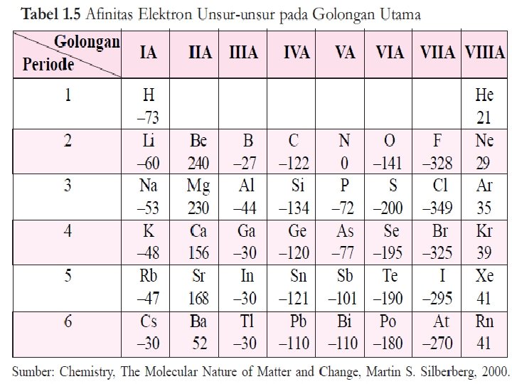 Dalam satu golongan AE dari atas ke bawah makin kecil Dalam satu periode AE dari kiri ke kanan makin besar ( paling besar VII A bukan VIIIA, perkecuali : IA>IIA, IVA>VA, VIIA>VIIIA) Jumlah elektron yang dapat diterima oleh suatu atom bisa lebih dari satu. AE 1<AE 2<AE 3