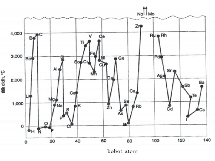 Titik leleh dan titik didih Titik leleh: suhu dimana tekanan uap zat padat sama dengan tekanan uap zat cairnya. Titik didih : suhu dimana tekanan uap zat cair sama dengan tekanan disekitarnya. Dalam satu golongan, unsur logam dari atas ke bawah berkurang dan unsur nonlogam dari atas ke bawah makin besar Dalam satu periode dari kiri ke kanan sampai IVA meningkat lalu berkurang mencapai harga terendah untuk golongan VIIIA.