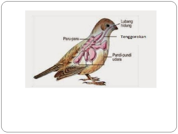 2. Burung memiliki alat pernapasan berupa paru-paru. Selain itu, burung memiliki kantong-kantong udara berdinding tipis. Kantong-kantong udara tersebut terhubung dengan paru-parunya. Ketika kantong udara digembungkan, tubuh burung sangat ringan. Kantong udara itu juga digunakan oleh burung untuk menyimpan udara yang digunakan pada waktu terbang. Pada saat terbang, burung tidak memasukkan udara melalui hidung. Tetapi dari pernapasannya berasal dari udara yang tersimpan dari pundi-pundi udara tersebut. Pada saat burung tidak mengepakkan sayapnya (terbang) burung mengisi kembali pundi-pundi udaranya dengan udara melalui hidung. Demikian pula saat burung hinggap di suatu tempat. Kemudian sisa pernapasan akan keluar melalui hidung. Jalannya pernapasan burung adalah: Udara masuk melalui hidung => tenggorokan => pundi – pundi udara => paru – paru.