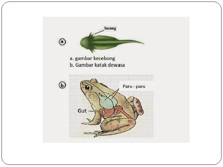 3. Amfibi Hewan yang hidup di dua alam yaitu di darat dan di air disebut amfibi. Amfibi memiliki alat pernapasan berupa paru – paru. Salah satu contoh hewan amfibi adalah katak. Alat pernapasan katak adalah paru-paru dan kulit. Namun, ketika masih berbentuk kecebong, katak hidup di dalam air dan bernapas menggunakan insang. Insang tersebut terletak di luar tubuhnya terdiri dari lembaran-lembaran kulit luar yang halus dan mengandung kapiler darah. Setelah berumur 9 hari, kecebong bernapas menggunakan insang dalam. Insang dalam akan menyusut seiring dengan mulai berfungsinya paru -paru. Kemudian katak muda tumbuh menjadi