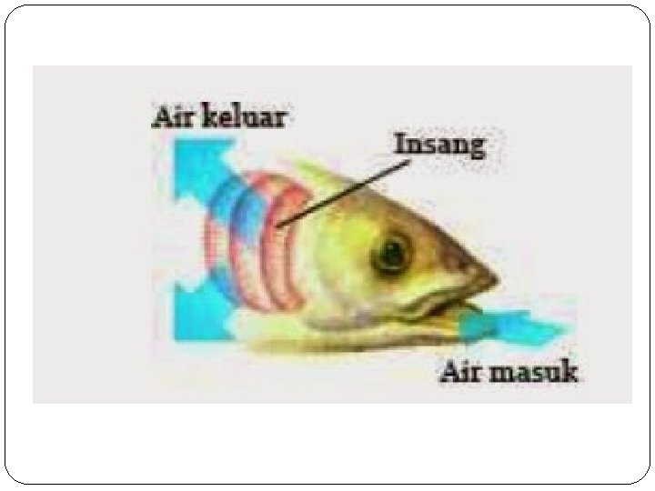 4. Ikan Alat pernapasan insang dimiliki oleh hewan yang hidup di air, seperti ikan. Ikan yang hidup di air tawar, air laut, maupun yang hidup di payau, semuanya bernapas dengan insang. Insang terletak pada bagian belakang kepala ikan. Insang terdiri atas lembar-lembar insang dan lengkung. Lembaran insang berwarna merah karena mengandung pembuluh darah. Pada lembaran insang terjadi pertukaran udara. Lengkung insang berwarna putih dan berfungsi sebagai tempat melekatnya lembaran insang.