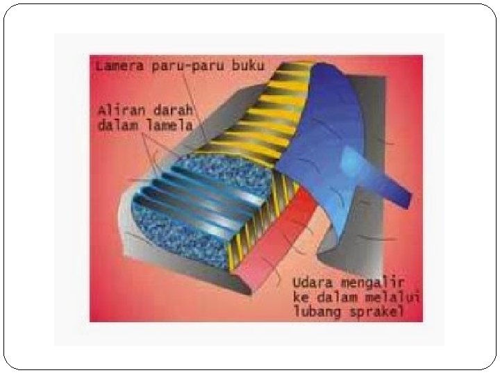 6. Kalajengking dan Laba-laba Kalajengking dan laba-laba besar (Arachnida) yang hidup di darat memiliki alat pernapasan berupa paru-paru buku, sedangkan jika hidup di air bernapas dengan insang buku. Paru-paru buku memiliki gulungan yang berasal dari invaginasi perut. Masing-masing paru-paru buku ini memiliki lembaran-lembaran tipis (lamela) yang tersusun berjajar. Paruparu buku ini juga memiliki spirakel tempat masuknya oksigen dari luar. Keluar masuknya udara disebabkan oleh gerakan otot yang terjadi secara teratur.