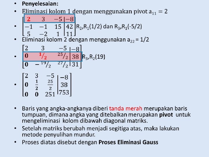 • Operasi-operasi berikut, bila diterapkan pada matriks lengkap akan menghasilkan sistem yang setara: – Pertukaran: urutan dua baris dapat ditukar – Penskalaan: perkalian sebuah baris dengan konstanta tidak nol – Penggantian: sebuah baris dapat diganti oleh jumlah baris itu dengan suatu kelipatan sembarang baris lainnya. • Contoh 3: 2 x 1 + 3 x 2 – 5 x 3 = -8 - x 1 – x 2 + 15 x 3 = 42 5 x 1 – 2 x 2 + x 3 = 11