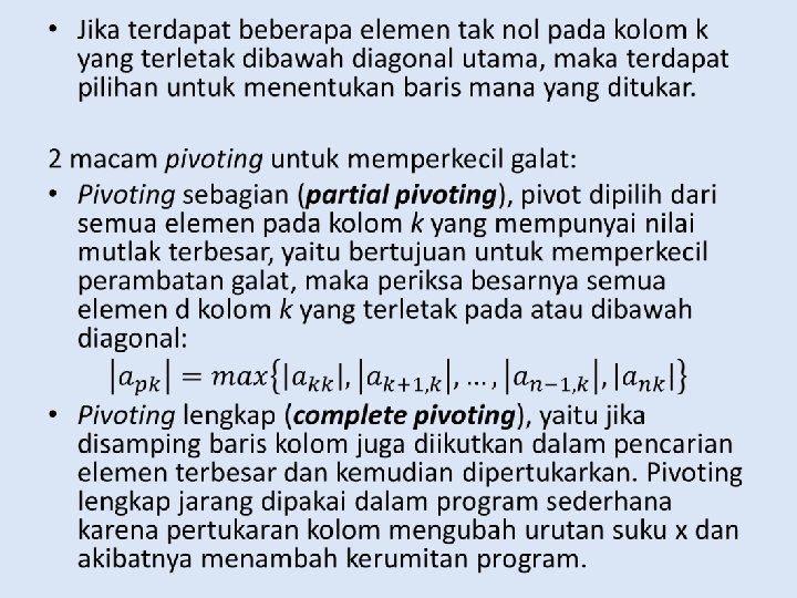 • Proses eliminasi Gauss harus dimodifikasi sehingga dapat dipakai dalam keadaan apapun. Kelemahan Eliminasi Gauss • Jika pivot akk = 0, maka baris ke-p tidak dapat digunakan untuk mengeliminasi elemen pada kolom k, karena terjadinya pembagian dengan nol. Oleh karena itu, pivot yang bernilai nol harus dihindari dengan strategy pivoting. • Metode Eliminasi Gauss dengan strategy pivoting disebut metode Eliminasi Gauss yang diperbaiki (Modified Gaussian Elimination)