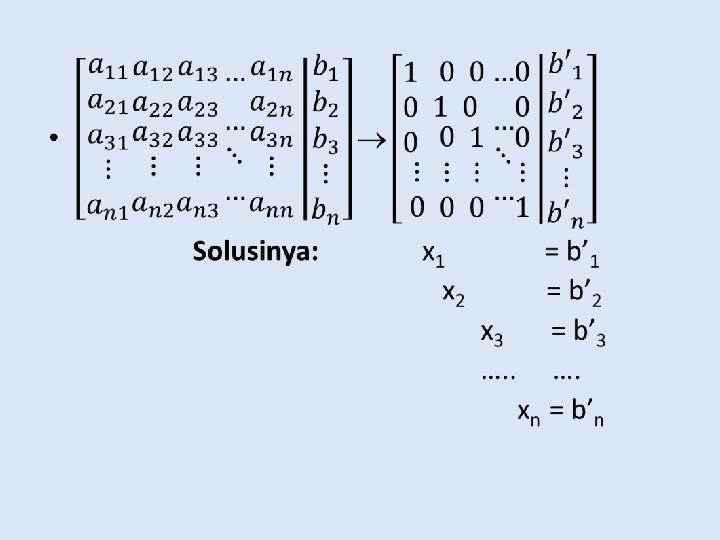 • Secara umum, sistem persamaan linear dengan n variabel dan m persamaan dapat disajikan dalam bentuk: a 11 x 1 + a 12 x 2 + … + a 1 nxn = b 1 a 21 x 1 + a 22 x 2 + … + a 2 nxn = b 2 … am 1 x 1 + am 2 x 2 + … + amnxn = bm • Dapat disajikan dalam notasi matriks Ax = b