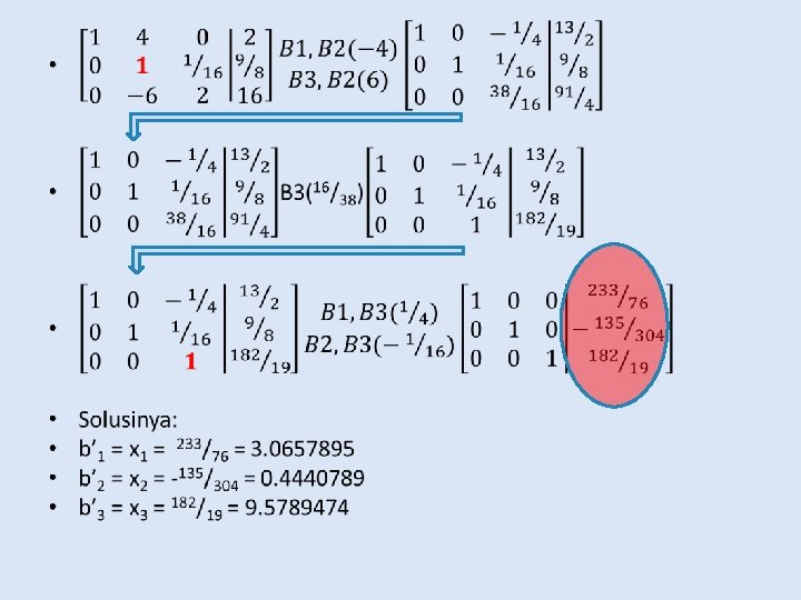 • Karena pada elemen a 22 =0, maka dilakukan pertukaran (*) antara baris 2 dan 3.