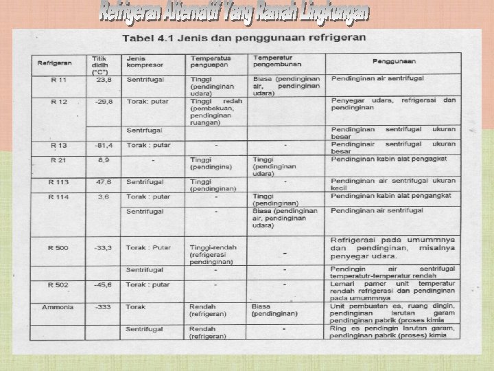 Persyaratan yang harus dimiliki suatu refrigeran adalah : q. Titik penguapan yang rendah q. Kestabilan tekanan q. Panas laten yang tinggi q. Mudah mengembun pada suhu ruang q. Mudah bercampur dengan oli pelumas q. Tidak korosif q. Tidak mudah terbakar q. Tidak beracun Back