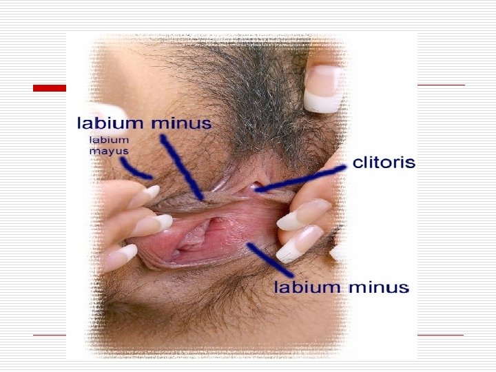 o Labia Majora n Bentuk lonjong & menonjol, lanjutan mons veneris n Homolog scrotum laki-laki o Labia Minora n Lipatan di medial labia majora n Kedua lipatan bertemu di belakang; fourchet (hanya tampak pd wanita blm melahirkan) o Clitoris n Merupakan tunggul erectil n Banyak saraf sensoris & pembuluh darah n Analog penis laki-laki